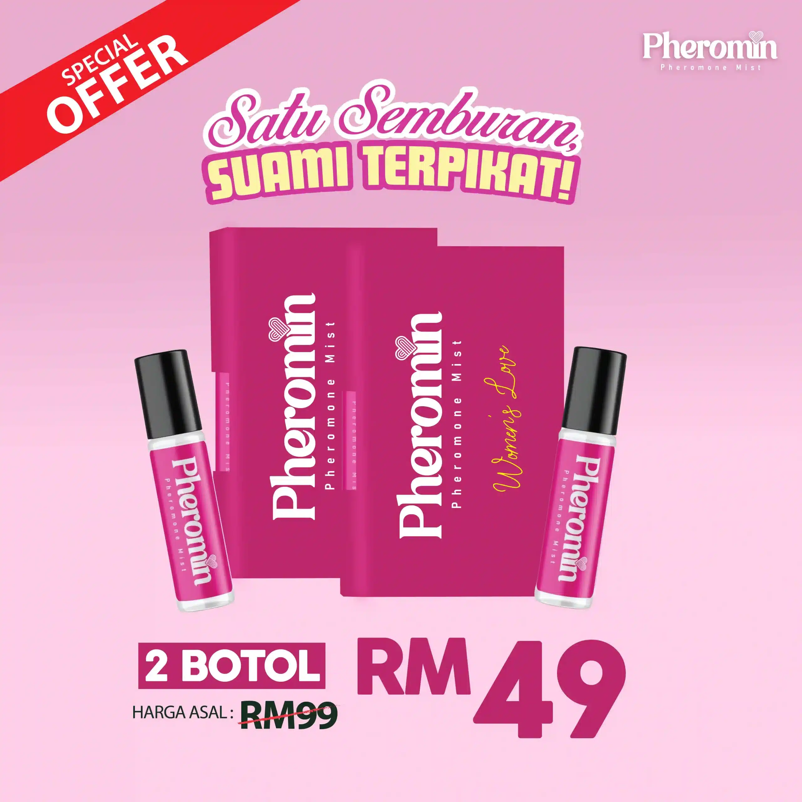 Lengkapkan kesan Femiluv dengan Pheromine Perfume – wangian pemikat yang bantu tingkatkan tarikan & aura kasih sayang. Spray sahaja di mana-mana di bahagian badan.